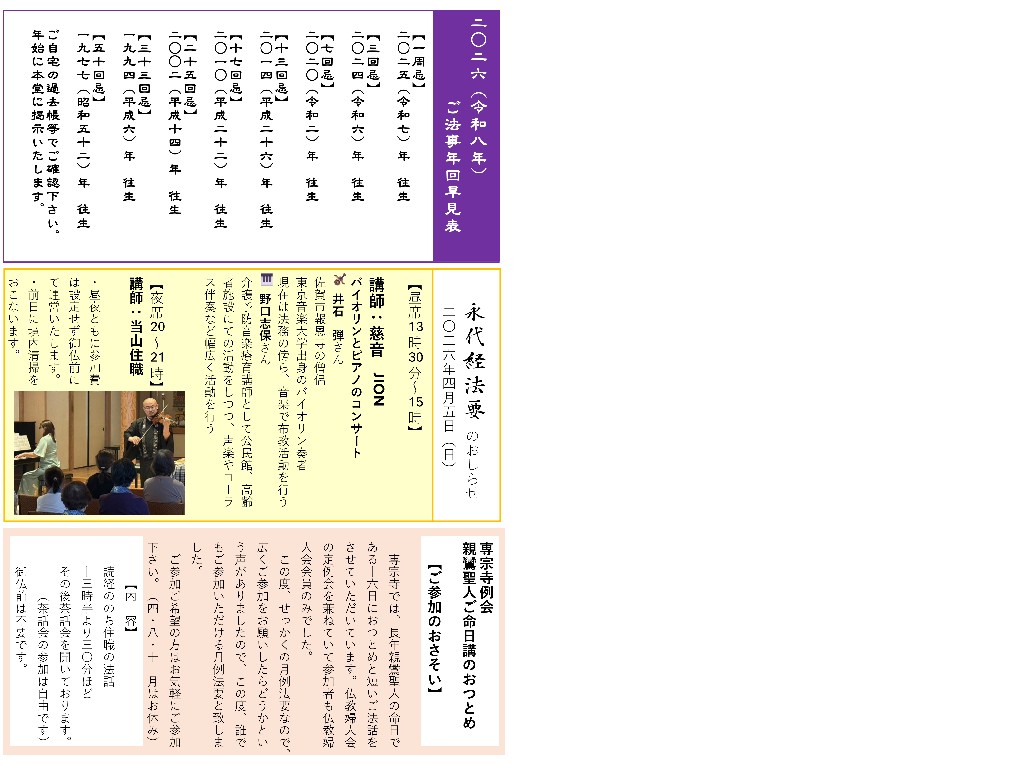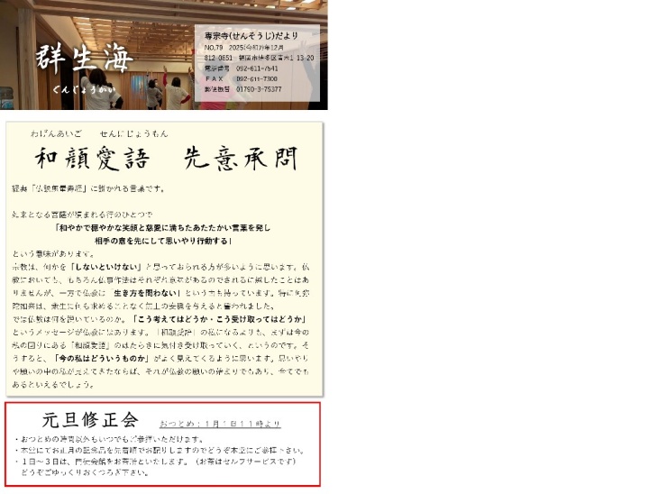 2025年12月 寺報「群生海」 2026/01/09 群生海 専宗寺寺報「群生海」第79号を門信徒及びご希望の方ににお送りしました。 合わせて2026年カレンダーも同封しております。 下の方にPDFのリンクをそうにゅうしております。 そちらもご利用下さい。 2025-12 群生海79 1-4 2025-12 群生海79 2-3