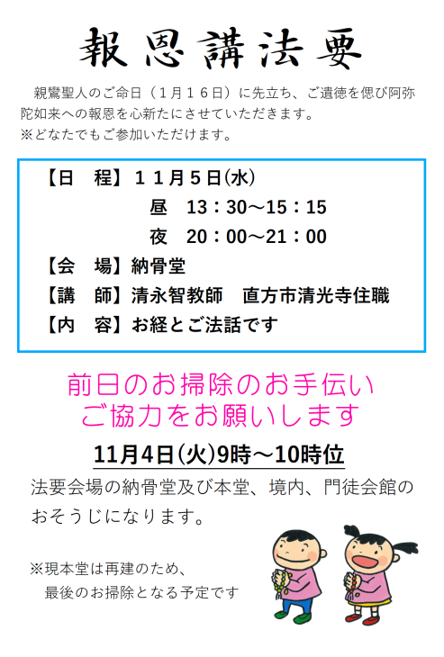 報恩講法要 11月5日 2025/10/22 2025年11月5日 報恩講法要のご案内をハガキで送付しました・・・が 一部の方に、裏面白紙で送ってしまいました・・・ 手作業による人為的ミスです。 申し訳ありません。 範囲特定次第再送の予定ですが間に合えばいいのですが・・・ 11月4日9:00~ お掃除 11月5日 昼13:30~ 夜20:00~ どうぞよろしくお願いいたします。