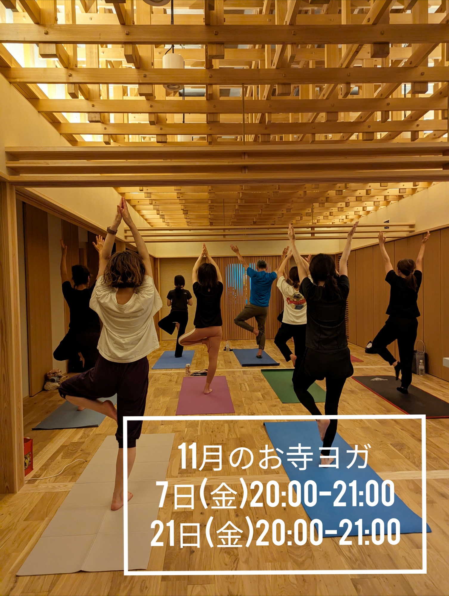 11月のお寺ヨガ 2025/11/07 11月の更新が遅くなりました・・・ 本日も開催ですがご案内です。 21日はイチョウのライトアップ中の予定です。 合わせてお楽しみいただければうれしいです。 参加費1000円 インストラクター 川村健二郎先生 ご持参いただくもの ・ヨガマット(持ってない方は貸し出しいたします) ・飲み物 その他 HPを見ての申込は、お寺にお電話ください。 気軽に参加できるヨガですよ。