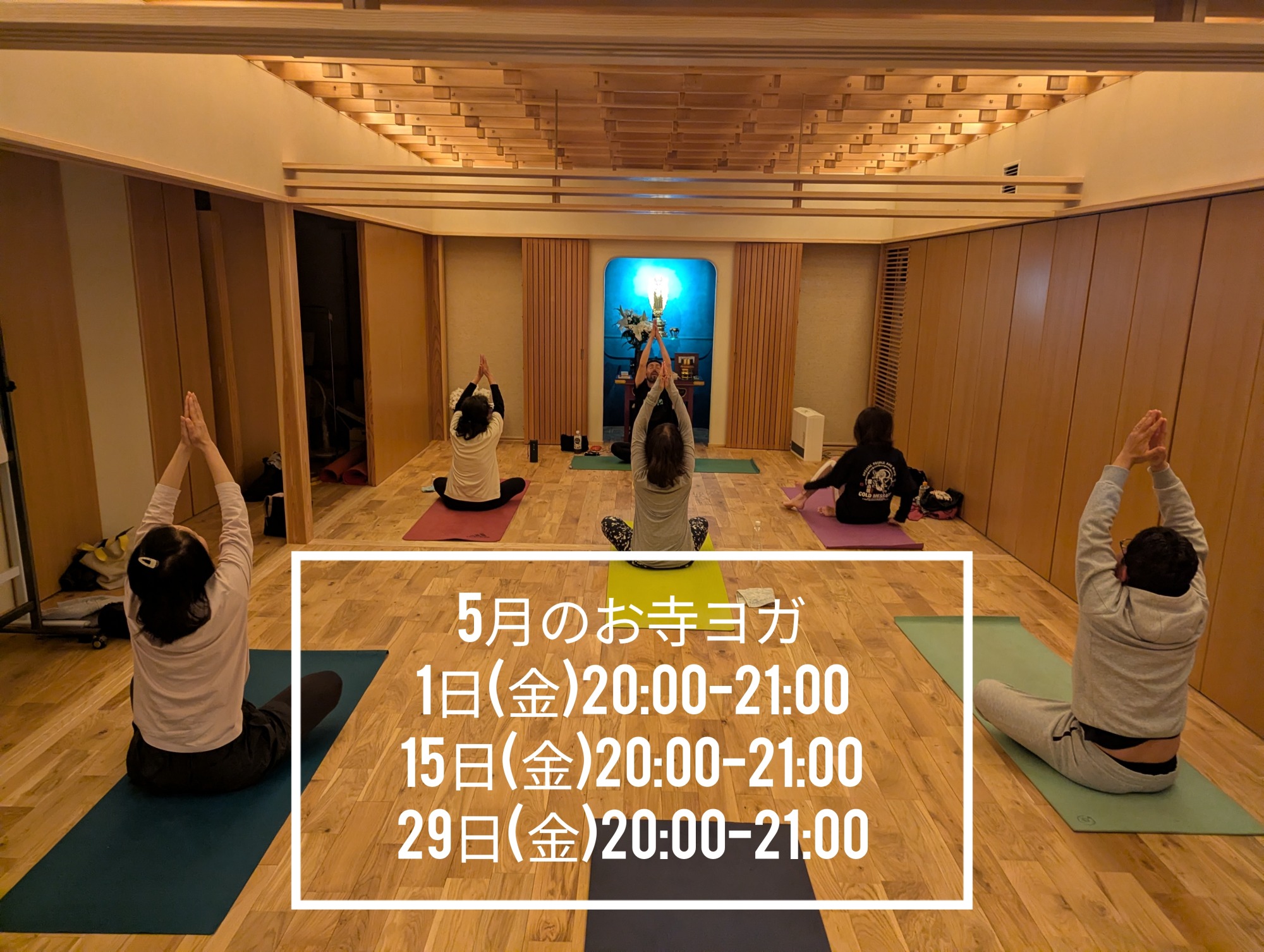 お寺ヨガ 5月の予定 2026/04/28 お寺ヨ5月の予定です。 今月は3回ありますよ。 参加費1000円 ご持参頂くもの ヨガマット(貸出有り) 飲み物 など インストラクター 川村健二郎先生 中央区平尾スヴァルナスタジオ店 お寺ヨガは、初めての方も大歓迎の、やさしめのヨガです。 身体が硬い方ほど、効果が現れやすいと思いますよ。 少し興味がある方も、是非チャレンジしてみて下さい。 問い合わせは専宗寺にどうぞ。